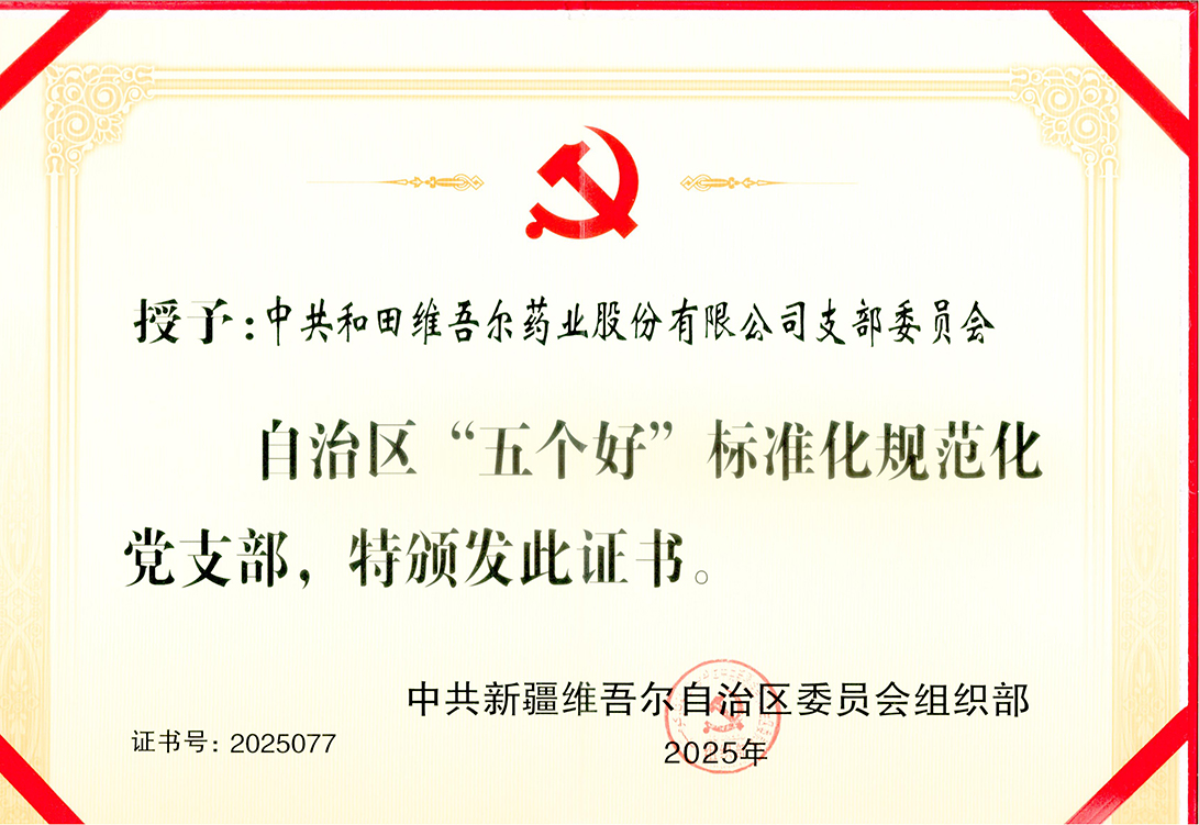 近日,和田维药党支部荣获自治区党委组织部颁发的“五个好”标准化规范化党支部称号。这一荣誉充分彰显了和田维药党支部在党建工作中的卓越表现和突出成效。